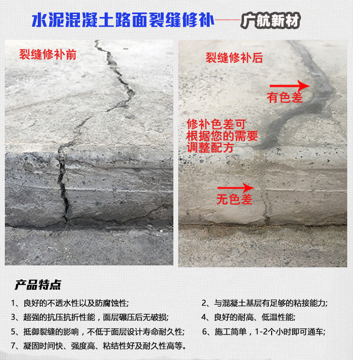 廣航新材20年來一直專注于路面修補(bǔ)材料的生產(chǎn)和施工。生產(chǎn)的水泥路面修補(bǔ)材料(GH高性能混泥土)具有修補(bǔ)、附著力強(qiáng)、耐磨、耐老化等功效。,并對(duì)混凝土路面起砂、起皮、裂縫處理有很好的效果,1小時(shí)即可通車。